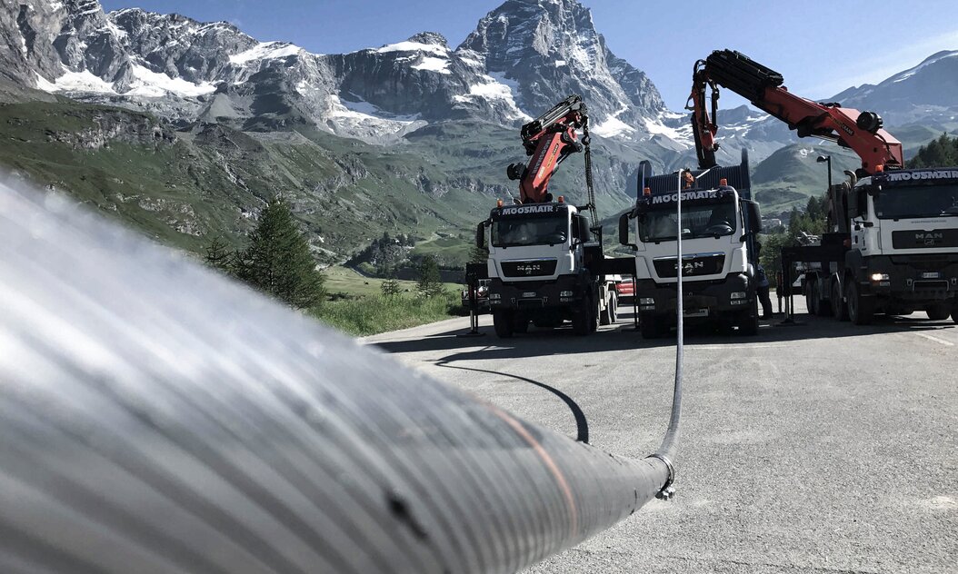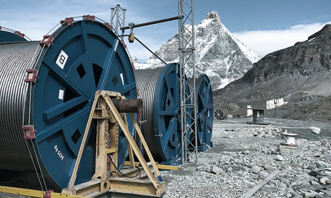 At 80 tonnes each, the cable reels were too heavy to be transported by truck from Cervinia to Lake Cime Bianche, so the individual cables first had to be transferred to two smaller reels and loaded onto two connected trucks before being re-spooled onto the original reel at their destination. From Lake Cime Bianche the new cables would then be winched to Trockener Steg via Furggsattel.